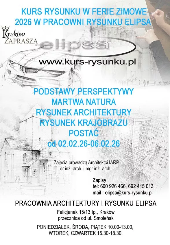 Organizatorzy zapraszają osoby zainteresowane kandydowaniem na studia lub sprawdzeniem się w meandrach rysunku odręcznego w trakcie kursu wakacyjnego 2025 w lipcu lub w sierpniu. Zajęcia pozwalają nie tylko poznać arkana tej pięknej sztuki w zakresie architektury i projektowania oraz również zwiedzić Kraków i ciekawe miejsca w mieście. W trakcie zajęć planujemy plenery m.in. w Parku Jordana, na Wawelu, Plantach, Ogrodzie Botanicznym oraz lokalizacjach Starego Miasta .